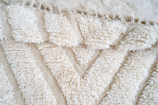 Chaque tapis est tissé nœud par nœud sur un métier à tisser traditionnel en bois, puis lavé et séché à la chaleur du soleil marocain. Votre patience sera récompensée par un tapis de qualité fait main qui perdurera toute une vie.